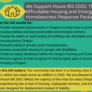 Why this bill matters: Our community has been in a housing crisis for years, which was made worse by wildfires in 2020. We are pleased to see that House Bill 2001 reflects the urgency of the crisis too many Oregonians are experiencing due to lack of housing, inadequate services, and eviction statutes designed for displacement instead of stability.